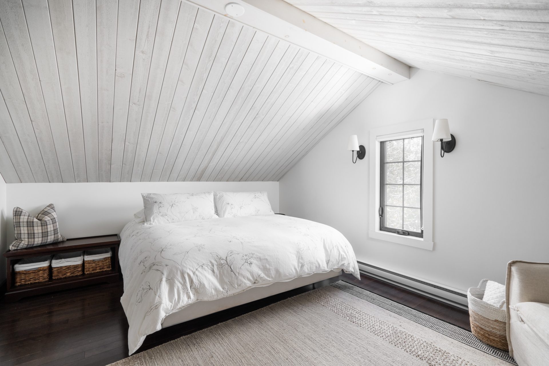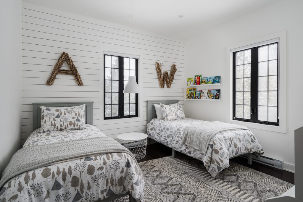 “Situé sur un domaine privé avec vue sur le lac, ce chalet quatre-saisons avait besoin d’un peu d’amour! Nous avons reconfiguré la salle de bain unique pour en créer deux plus petites mais entièrement fonctionnelles et à l’étage (mezzanine) nous avons ajouté une quatrième chambre à coucher. Tous les éléments décoratifs ont été selectionnés en harmonie avec le style familial de ce chalet campagnard. ”